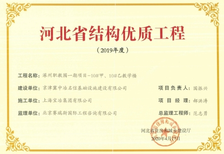 近日,中冶置业涿州职教园项目4号楼、10号楼荣获“2019年度河北省结构优质工程”奖项。