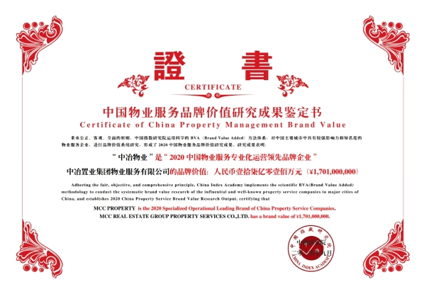 凭借扎实的发展、良好的品牌美誉度以及客户满意度的稳步提升,中冶物业荣获“2020 中国物业服务专业化运营领先品牌企业”,品牌估值17亿元,彰显了企业品牌实力与价值。